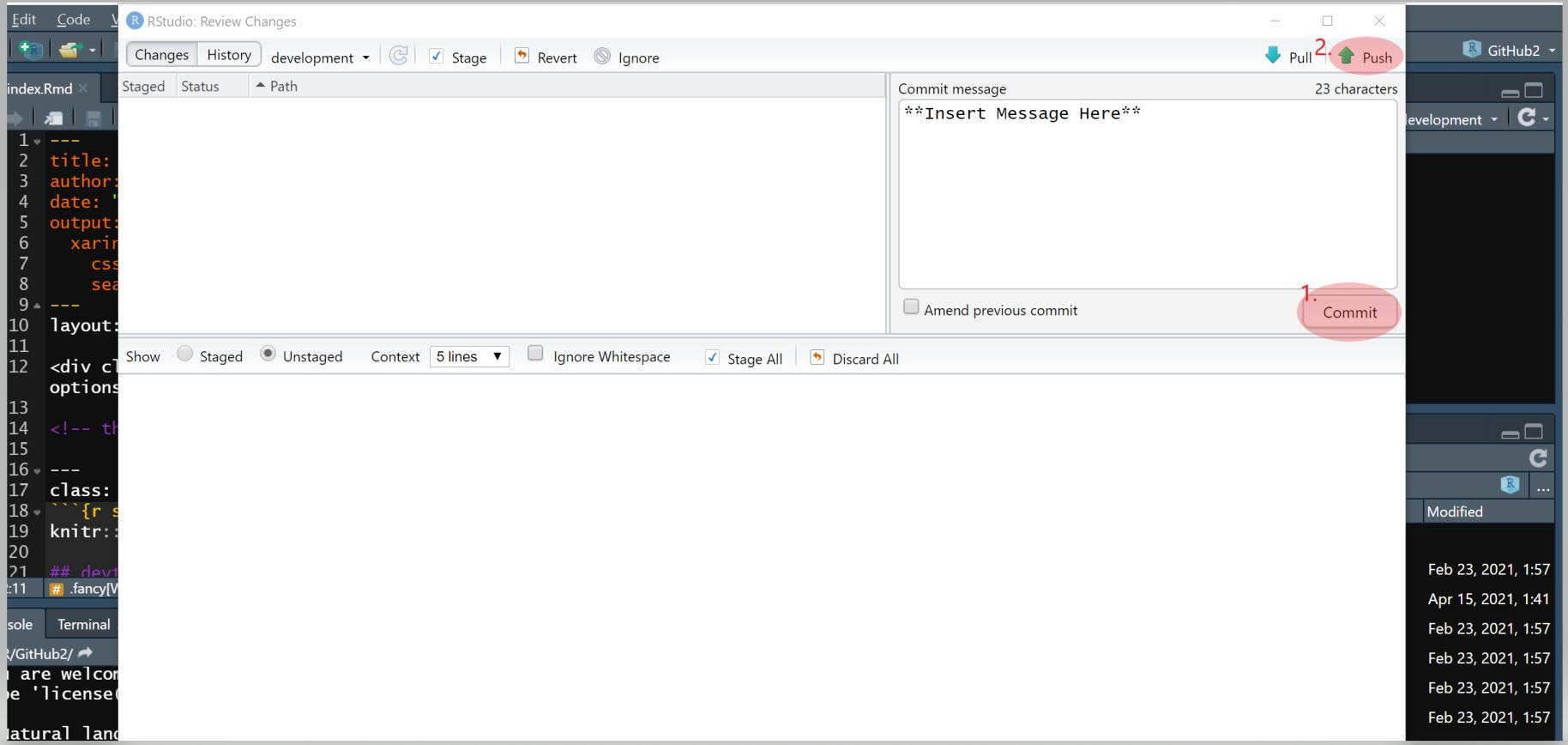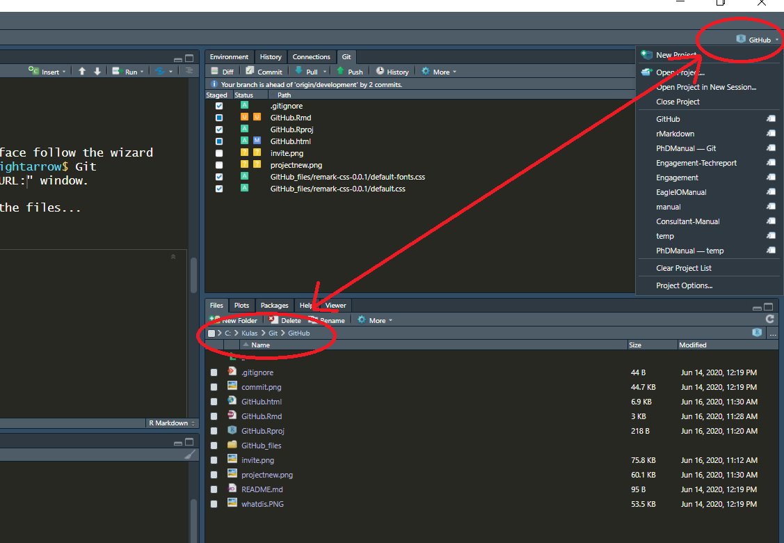 layout: true <div class="my-footer"><span>Press your keyboard's "h" key to access presentation options</span></div> <!-- this adds the link footer to all slides, depends on my-footer class in css--> --- .left-column[# Using GitHub <svg viewBox="0 0 496 512" style="height:1em;position:relative;display:inline-block;top:.1em;" xmlns="http://www.w3.org/2000/svg"> <path d="M165.9 397.4c0 2-2.3 3.6-5.2 3.6-3.3.3-5.6-1.3-5.6-3.6 0-2 2.3-3.6 5.2-3.6 3-.3 5.6 1.3 5.6 3.6zm-31.1-4.5c-.7 2 1.3 4.3 4.3 4.9 2.6 1 5.6 0 6.2-2s-1.3-4.3-4.3-5.2c-2.6-.7-5.5.3-6.2 2.3zm44.2-1.7c-2.9.7-4.9 2.6-4.6 4.9.3 2 2.9 3.3 5.9 2.6 2.9-.7 4.9-2.6 4.6-4.6-.3-1.9-3-3.2-5.9-2.9zM244.8 8C106.1 8 0 113.3 0 252c0 110.9 69.8 205.8 169.5 239.2 12.8 2.3 17.3-5.6 17.3-12.1 0-6.2-.3-40.4-.3-61.4 0 0-70 15-84.7-29.8 0 0-11.4-29.1-27.8-36.6 0 0-22.9-15.7 1.6-15.4 0 0 24.9 2 38.6 25.8 21.9 38.6 58.6 27.5 72.9 20.9 2.3-16 8.8-27.1 16-33.7-55.9-6.2-112.3-14.3-112.3-110.5 0-27.5 7.6-41.3 23.6-58.9-2.6-6.5-11.1-33.3 2.6-67.9 20.9-6.5 69 27 69 27 20-5.6 41.5-8.5 62.8-8.5s42.8 2.9 62.8 8.5c0 0 48.1-33.6 69-27 13.7 34.7 5.2 61.4 2.6 67.9 16 17.7 25.8 31.5 25.8 58.9 0 96.5-58.9 104.2-114.8 110.5 9.2 7.9 17 22.9 17 46.4 0 33.7-.3 75.4-.3 83.6 0 6.5 4.6 14.4 17.3 12.1C428.2 457.8 496 362.9 496 252 496 113.3 383.5 8 244.8 8zM97.2 352.9c-1.3 1-1 3.3.7 5.2 1.6 1.6 3.9 2.3 5.2 1 1.3-1 1-3.3-.7-5.2-1.6-1.6-3.9-2.3-5.2-1zm-10.8-8.1c-.7 1.3.3 2.9 2.3 3.9 1.6 1 3.6.7 4.3-.7.7-1.3-.3-2.9-2.3-3.9-2-.6-3.6-.3-4.3.7zm32.4 35.6c-1.6 1.3-1 4.3 1.3 6.2 2.3 2.3 5.2 2.6 6.5 1 1.3-1.3.7-4.3-1.3-6.2-2.2-2.3-5.2-2.6-6.5-1zm-11.4-14.7c-1.6 1-1.6 3.6 0 5.9 1.6 2.3 4.3 3.3 5.6 2.3 1.6-1.3 1.6-3.9 0-6.2-1.4-2.3-4-3.3-5.6-2z"></path></svg> through <svg viewBox="0 0 581 512" style="height:1em;position:relative;display:inline-block;top:.1em;fill:royalblue;" xmlns="http://www.w3.org/2000/svg"> <path d="M581 226.6C581 119.1 450.9 32 290.5 32S0 119.1 0 226.6C0 322.4 103.3 402 239.4 418.1V480h99.1v-61.5c24.3-2.7 47.6-7.4 69.4-13.9L448 480h112l-67.4-113.7c54.5-35.4 88.4-84.9 88.4-139.7zm-466.8 14.5c0-73.5 98.9-133 220.8-133s211.9 40.7 211.9 133c0 50.1-26.5 85-70.3 106.4-2.4-1.6-4.7-2.9-6.4-3.7-10.2-5.2-27.8-10.5-27.8-10.5s86.6-6.4 86.6-92.7-90.6-87.9-90.6-87.9h-199V361c-74.1-21.5-125.2-67.1-125.2-119.9zm225.1 38.3v-55.6c57.8 0 87.8-6.8 87.8 27.3 0 36.5-38.2 28.3-87.8 28.3zm-.9 72.5H365c10.8 0 18.9 11.7 24 19.2-16.1 1.9-33 2.8-50.6 2.9v-22.1z"></path></svg> Studio ] <div class="right"> .right-column[  ### Summer 2020 Eagle I.O tutorial  ] </div> --- class: inverse ### [Eagle I.O](https://www.eagle-io.com/) Contributors: <font size="5"> .pull-left[ [<svg viewBox="0 0 448 512" style="height:1em;position:relative;display:inline-block;top:.1em;fill:cornflowerblue;" xmlns="http://www.w3.org/2000/svg"> <path d="M416 32H31.9C14.3 32 0 46.5 0 64.3v383.4C0 465.5 14.3 480 31.9 480H416c17.6 0 32-14.5 32-32.3V64.3c0-17.8-14.4-32.3-32-32.3zM135.4 416H69V202.2h66.5V416zm-33.2-243c-21.3 0-38.5-17.3-38.5-38.5S80.9 96 102.2 96c21.2 0 38.5 17.3 38.5 38.5 0 21.3-17.2 38.5-38.5 38.5zm282.1 243h-66.4V312c0-24.8-.5-56.7-34.5-56.7-34.6 0-39.9 27-39.9 54.9V416h-66.4V202.2h63.7v29.2h.9c8.9-16.8 30.6-34.5 62.9-34.5 67.2 0 79.7 44.3 79.7 101.9V416z"></path></svg>](https://www.linkedin.com/in/renatagppr/) .fancy[Renata GarcΓa Prieto Palacios Roji]  [<svg viewBox="0 0 448 512" style="height:1em;position:relative;display:inline-block;top:.1em;fill:cornflowerblue;" xmlns="http://www.w3.org/2000/svg"> <path d="M416 32H31.9C14.3 32 0 46.5 0 64.3v383.4C0 465.5 14.3 480 31.9 480H416c17.6 0 32-14.5 32-32.3V64.3c0-17.8-14.4-32.3-32-32.3zM135.4 416H69V202.2h66.5V416zm-33.2-243c-21.3 0-38.5-17.3-38.5-38.5S80.9 96 102.2 96c21.2 0 38.5 17.3 38.5 38.5 0 21.3-17.2 38.5-38.5 38.5zm282.1 243h-66.4V312c0-24.8-.5-56.7-34.5-56.7-34.6 0-39.9 27-39.9 54.9V416h-66.4V202.2h63.7v29.2h.9c8.9-16.8 30.6-34.5 62.9-34.5 67.2 0 79.7 44.3 79.7 101.9V416z"></path></svg>](https://www.linkedin.com/in/noel-d-souza-60101a125/) .fancy[Noel D'Souza]  ] .pull-right[ [<svg viewBox="0 0 448 512" style="height:1em;position:relative;display:inline-block;top:.1em;fill:cornflowerblue;" xmlns="http://www.w3.org/2000/svg"> <path d="M416 32H31.9C14.3 32 0 46.5 0 64.3v383.4C0 465.5 14.3 480 31.9 480H416c17.6 0 32-14.5 32-32.3V64.3c0-17.8-14.4-32.3-32-32.3zM135.4 416H69V202.2h66.5V416zm-33.2-243c-21.3 0-38.5-17.3-38.5-38.5S80.9 96 102.2 96c21.2 0 38.5 17.3 38.5 38.5 0 21.3-17.2 38.5-38.5 38.5zm282.1 243h-66.4V312c0-24.8-.5-56.7-34.5-56.7-34.6 0-39.9 27-39.9 54.9V416h-66.4V202.2h63.7v29.2h.9c8.9-16.8 30.6-34.5 62.9-34.5 67.2 0 79.7 44.3 79.7 101.9V416z"></path></svg>](https://www.linkedin.com/in/casey-osorio-duffoo/) .fancy[Casey Osorio-Duffoo]  [<svg viewBox="0 0 448 512" style="height:1em;position:relative;display:inline-block;top:.1em;fill:cornflowerblue;" xmlns="http://www.w3.org/2000/svg"> <path d="M416 32H31.9C14.3 32 0 46.5 0 64.3v383.4C0 465.5 14.3 480 31.9 480H416c17.6 0 32-14.5 32-32.3V64.3c0-17.8-14.4-32.3-32-32.3zM135.4 416H69V202.2h66.5V416zm-33.2-243c-21.3 0-38.5-17.3-38.5-38.5S80.9 96 102.2 96c21.2 0 38.5 17.3 38.5 38.5 0 21.3-17.2 38.5-38.5 38.5zm282.1 243h-66.4V312c0-24.8-.5-56.7-34.5-56.7-34.6 0-39.9 27-39.9 54.9V416h-66.4V202.2h63.7v29.2h.9c8.9-16.8 30.6-34.5 62.9-34.5 67.2 0 79.7 44.3 79.7 101.9V416z"></path></svg>](https://www.linkedin.com/in/john-kulas-184a031/) .fancy[John Kulas]  ] </font> --- ## Topics covered 1. How (and why) to integrate GitHub <svg viewBox="0 0 496 512" style="height:1em;position:relative;display:inline-block;top:.1em;" xmlns="http://www.w3.org/2000/svg"> <path d="M165.9 397.4c0 2-2.3 3.6-5.2 3.6-3.3.3-5.6-1.3-5.6-3.6 0-2 2.3-3.6 5.2-3.6 3-.3 5.6 1.3 5.6 3.6zm-31.1-4.5c-.7 2 1.3 4.3 4.3 4.9 2.6 1 5.6 0 6.2-2s-1.3-4.3-4.3-5.2c-2.6-.7-5.5.3-6.2 2.3zm44.2-1.7c-2.9.7-4.9 2.6-4.6 4.9.3 2 2.9 3.3 5.9 2.6 2.9-.7 4.9-2.6 4.6-4.6-.3-1.9-3-3.2-5.9-2.9zM244.8 8C106.1 8 0 113.3 0 252c0 110.9 69.8 205.8 169.5 239.2 12.8 2.3 17.3-5.6 17.3-12.1 0-6.2-.3-40.4-.3-61.4 0 0-70 15-84.7-29.8 0 0-11.4-29.1-27.8-36.6 0 0-22.9-15